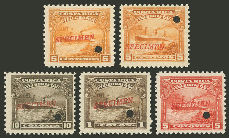 Ship, 5 stamps with SPECIMEN overprint and punch hole, all different (the 5c. with different ovpt.), excellent quality! (Image)