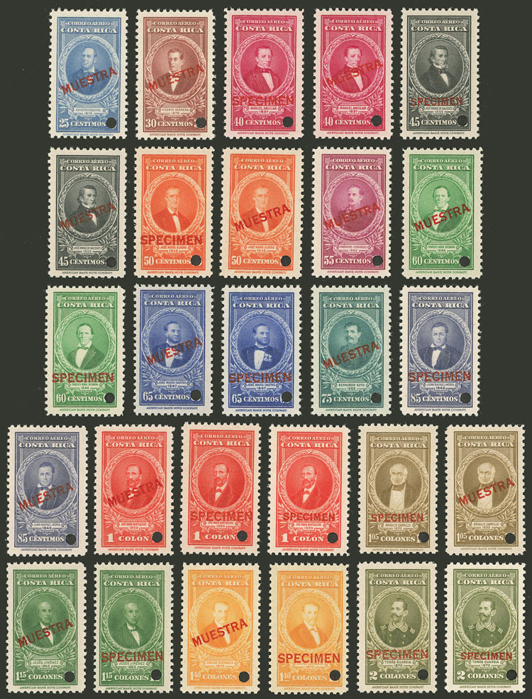 108/121, 1945/6 Próceres, complete set of 15 values with SPECIMEN or MUESTRA overprint and punch hole, in total 27 different examples (of several values we include different overprints), MNH, excellent quality! (Image)