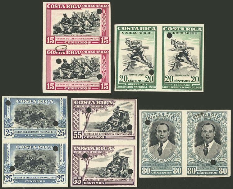 Yv.188/9190 + 192 + 194, 1950 Liberation war, 5 values of the set of 8 in IMPERFORATE PAIRS with punch hole (specimens of the printing house), the 15c. pair has a mark indicating an error to be corrected (in the margin), very fine