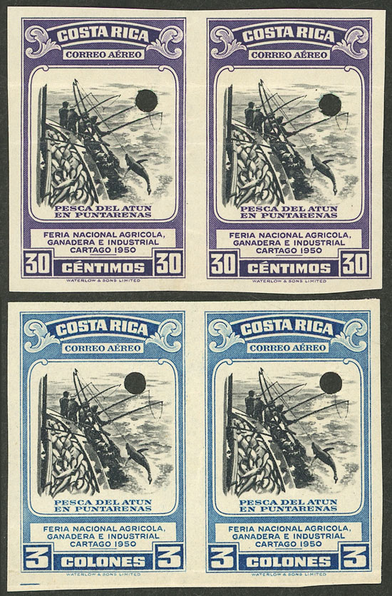 201 + 207, 1950 Tuna fishing 30c. and 3C., IMPERFORATE pairs with punch hole (specimens), with light creases, very nice! (Image)