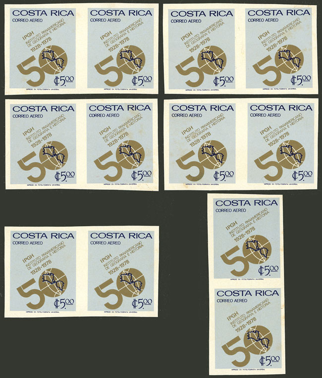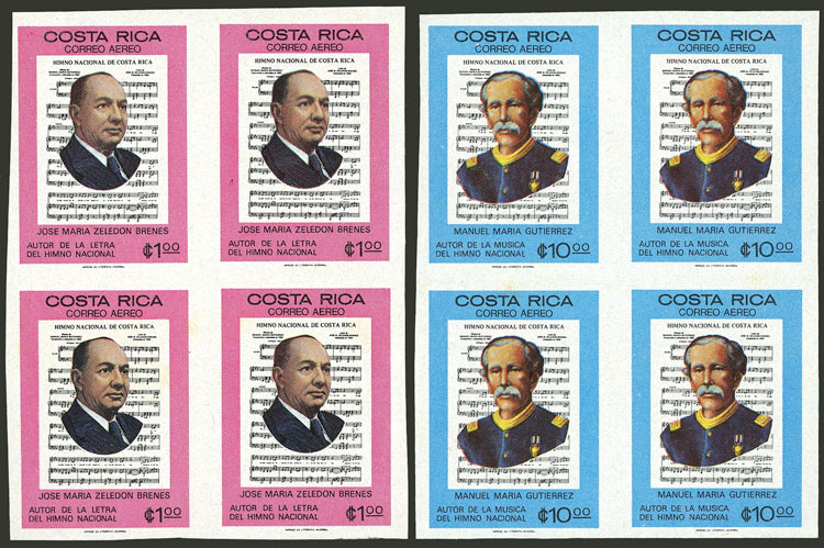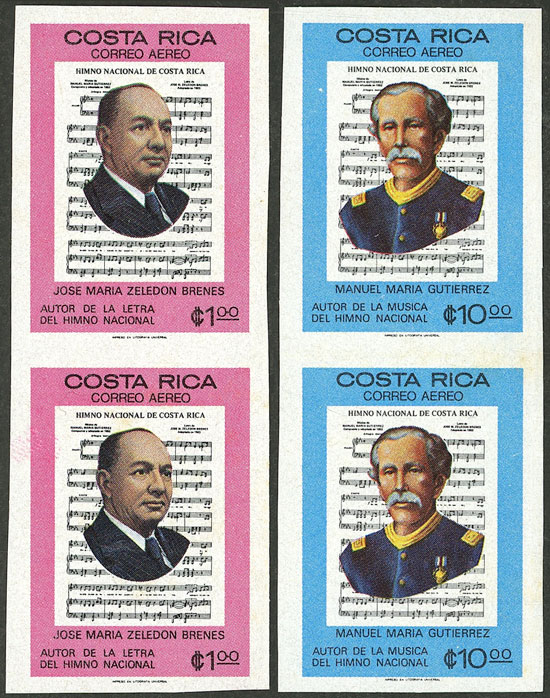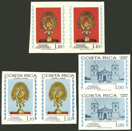 Sc.C691, C692, 1977 Religion 1C in IMPERFORATE PAIR mint without gum + 1.10C. x2 IMPERFORATE PAIRS, one in different colors and without "COSTA RICA" inscription, both with part gum, very good lot! (Image)