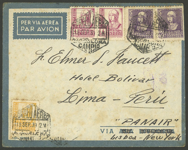 Airmail cover sent from Barcelona to Peru on 18/SE/1939 with colorful postage, via PANAIR, addressed to Elmer J. Faucett, founder of "Faucett Airlines" in Peru, interesting! (Image) (Image-02)