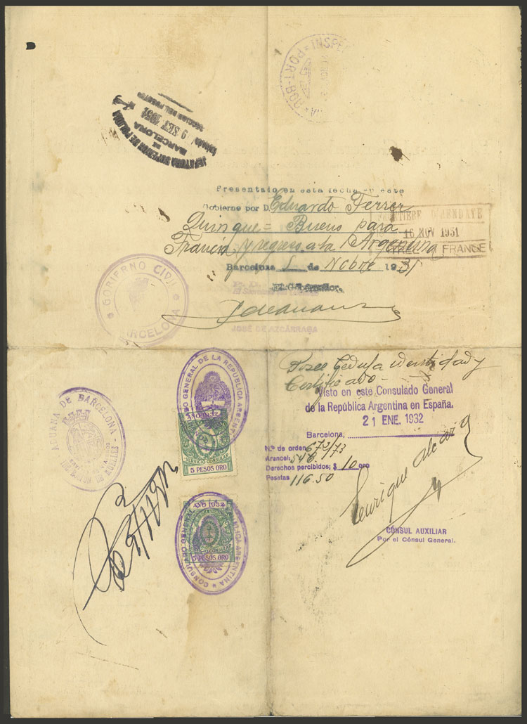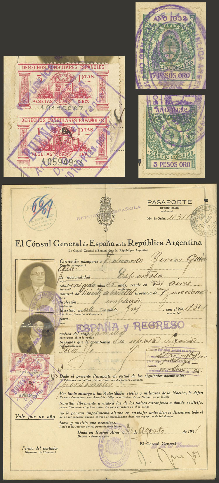 Passport granted to a couple in 1931 by the Spanish consul in Buenos Aires, with consular revenue stamps of 1P. and 5P., and Argentine stamps on back, very nice! (Image) (Image-02)