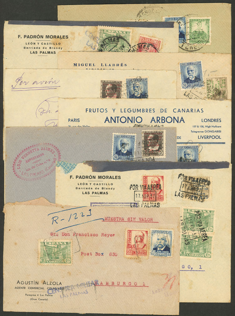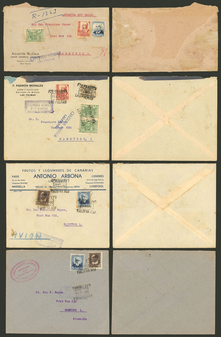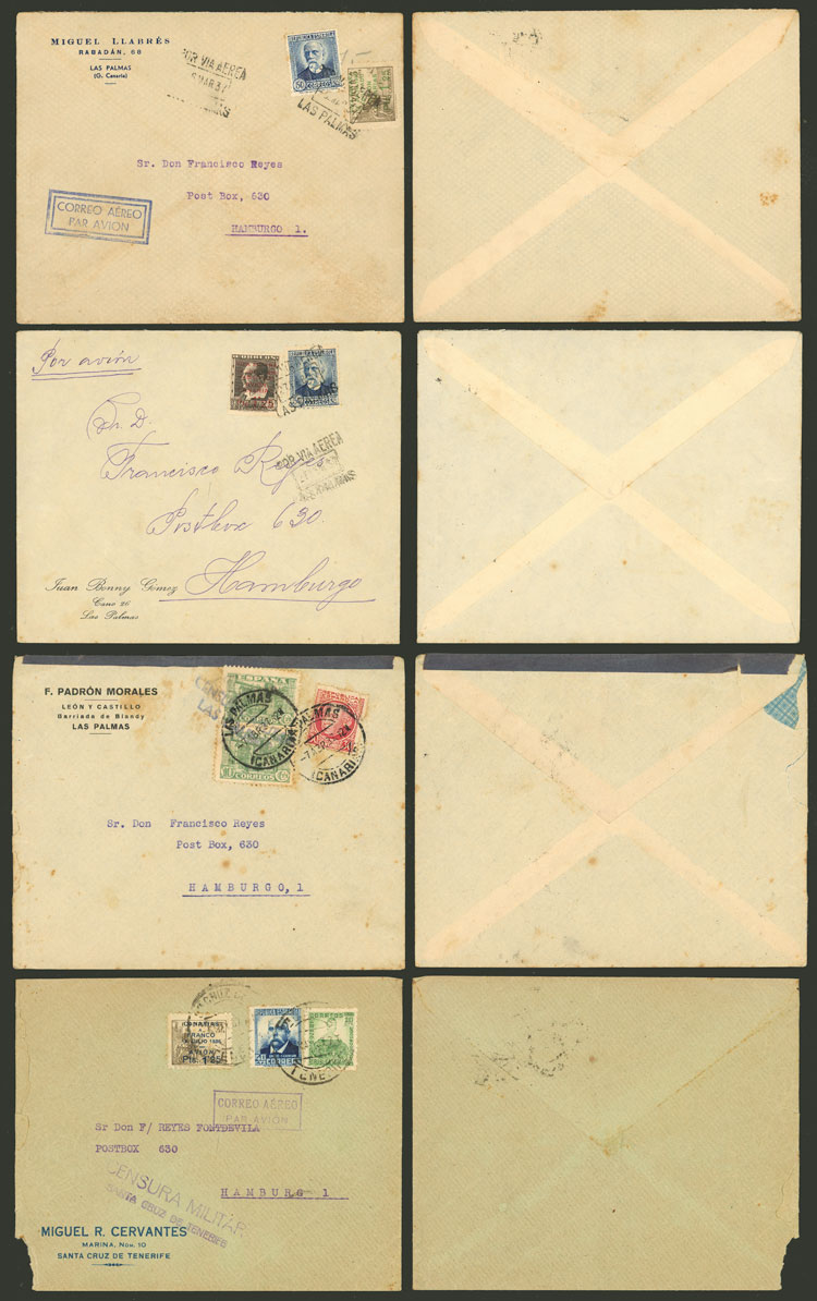Airmail covers + 1 front of registered cover, sent in 1937 from Las Palmas to Germany with nice frankings, interesting! IMPORTANT: Please view ALL the photos of the lot, because all the material has been scanned. (Image) (Image-02)