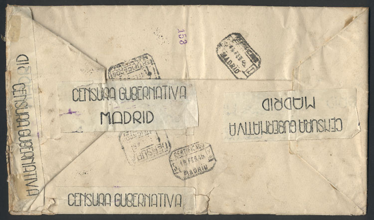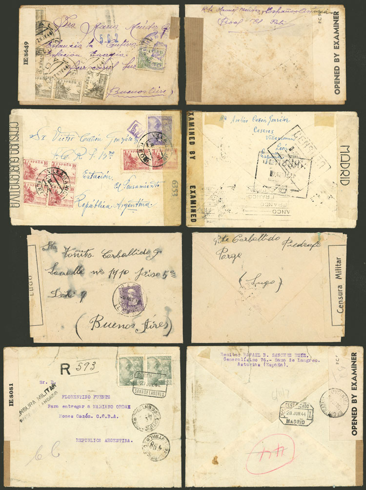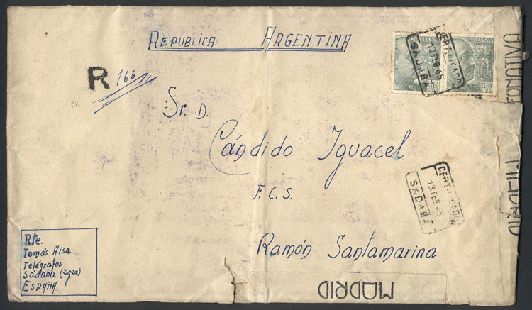 Registered folded cover sent from SÁBADA (Zaragoza) to Argentina on 13/FE/1945, with a number of censor marks and labels, very nice! (Image) (Image-02)