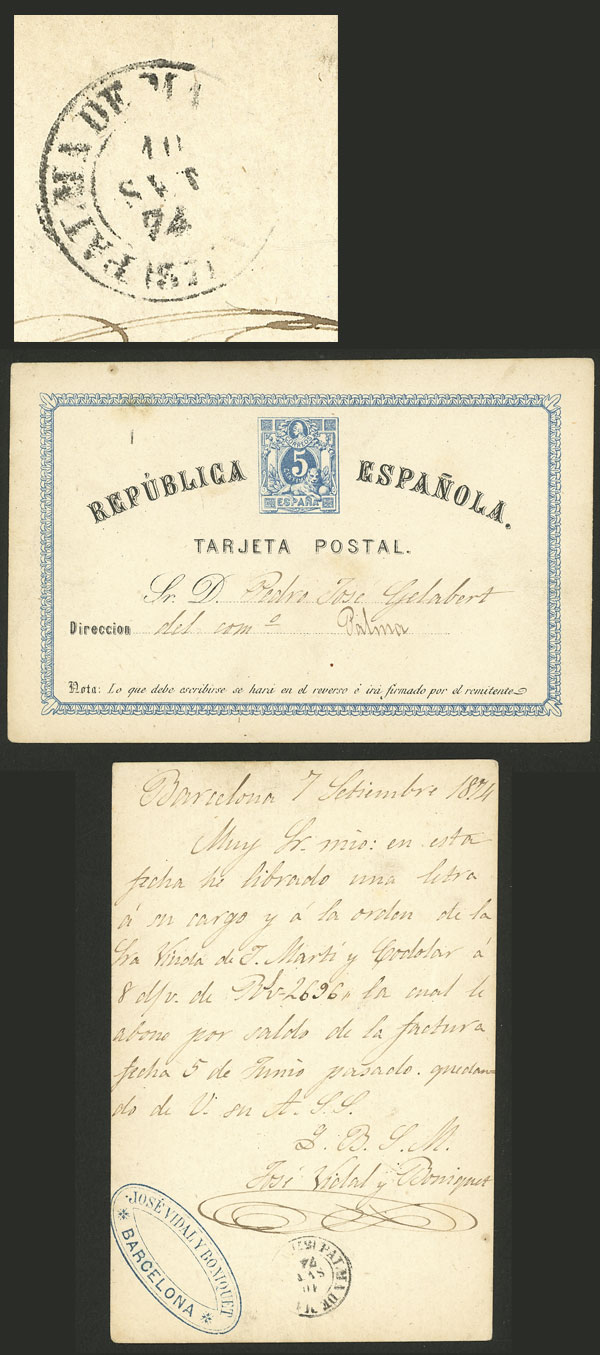Postal card sent from Barcelona to Palma on 7/SE/1874, with arrival backstamp of 10/SE, VF quality! (Image)