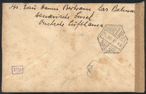 Airmail cover franked with 3.75Ptas. sent from LAS PALMAS (Canary Islands) to Berlin on 23/JUL/1942, with several postal marks and censors (including one Nazi German censor 'OKW'), fine quality, very interesting! (Image) (Image-02)