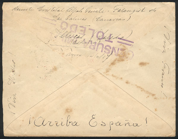 Cover sent to Germany on 7/JA/1937 by a combatant of the Spanish Civil War: "Falangista de Las Palmas (Canarias)", from ILLESCAS (Toledo), stampless and marked "FRANQUICIA POSTAL DE GUERRA", censored and with other interesting marks,