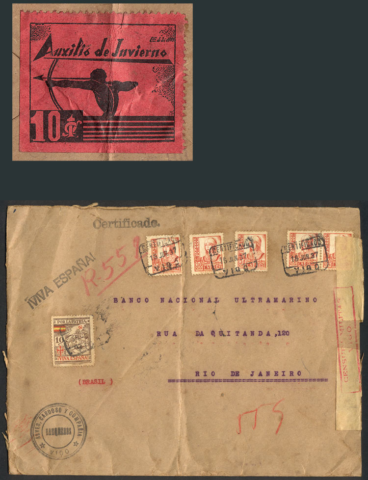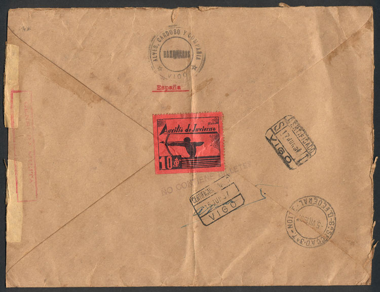 Registered cover sent from Vigo to Rio de Janeiro on 15/JUN/1937, with censor mark and interesting cinderella on back! (Image) (Image-02)