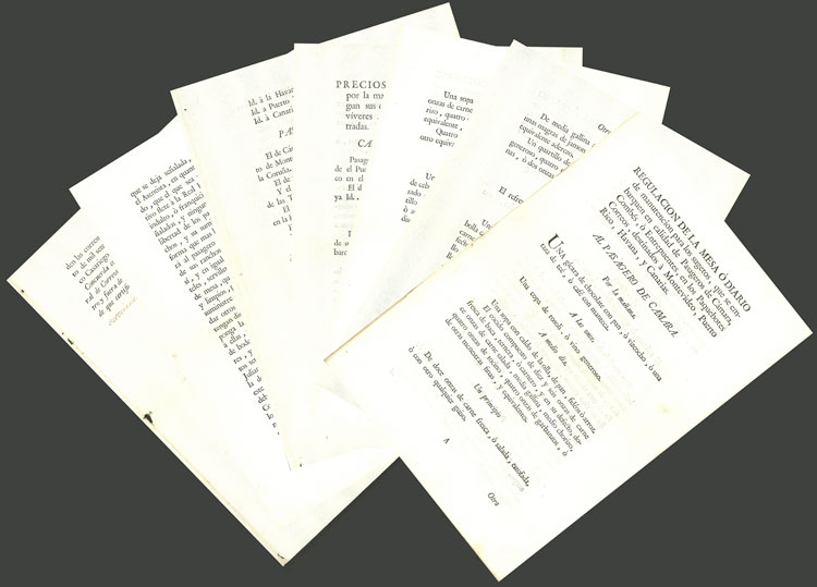ORIGINAL printed document of 7 pages dated in 1778, indicating the portions that were to be served to passengers of mail paquebots travelling between La Coruña and Montevideo, Puerto Rico, Havana and Canarias, or back. Also with