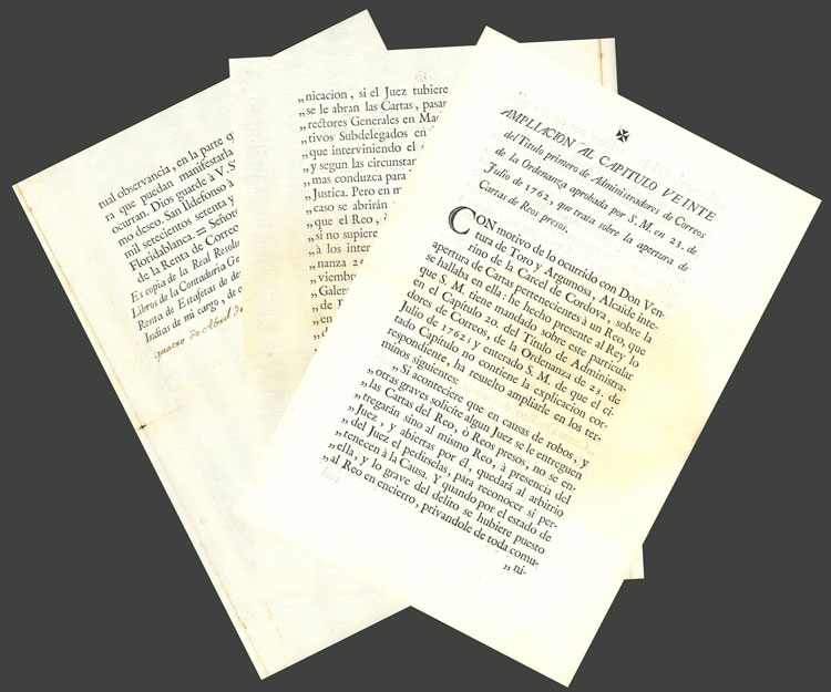 ORIGINAL printed document of 3 pages dated in 1778, indicating the procedure for opening letters sent to PRISONERS, and the punishments if the corresponding instructions were not followed (10 years in galleys or prison ). Also