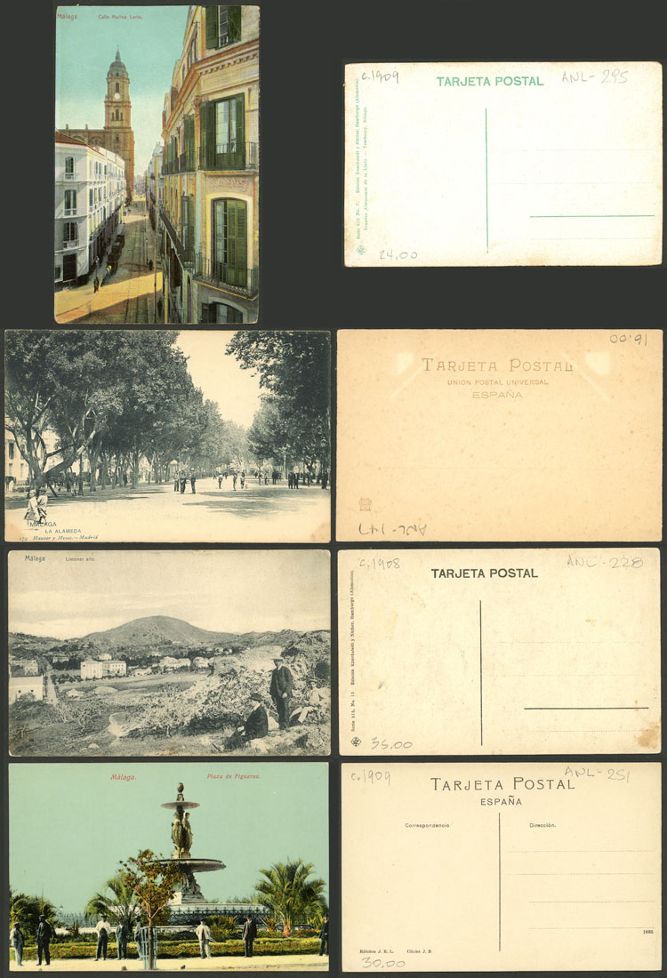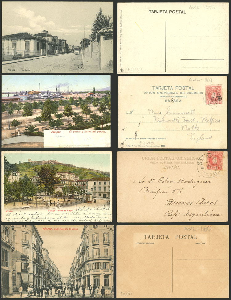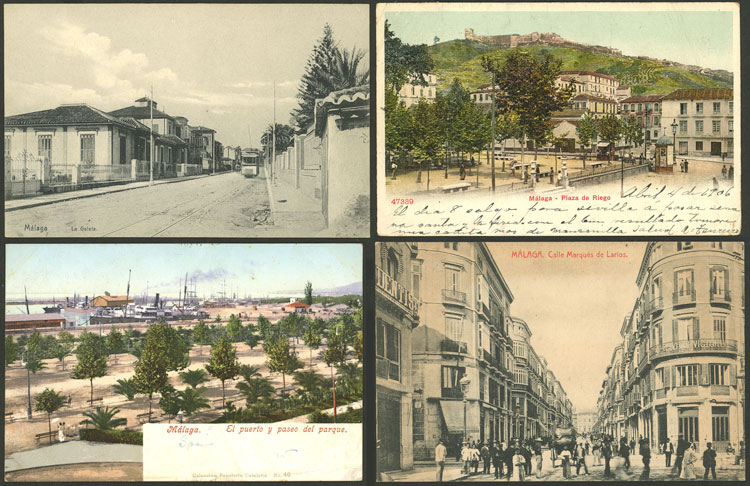 MÁLAGA: 8 Old postcards with very good views, fine to VF general quality. ATTENTION: please view all the photos of this lot, because all the cards have been scanned (both sides). (Image) (Image-02)