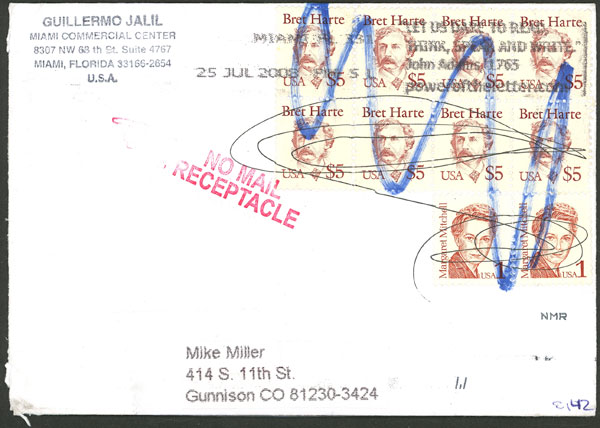 POSTAGE of $40,02 (the clerk mixed up the stamps of $5 and 5c!) on a cover sent by first class mail from Miami to Gunnison on 25/JUL/2008, returned to sender marked "NO MAIL RECEPTACLE", VF quality and very attractive! (Image)
