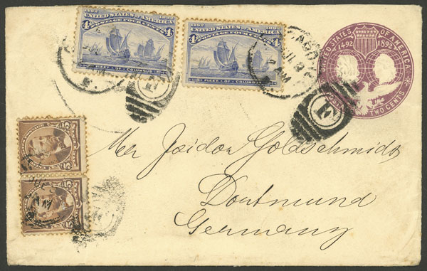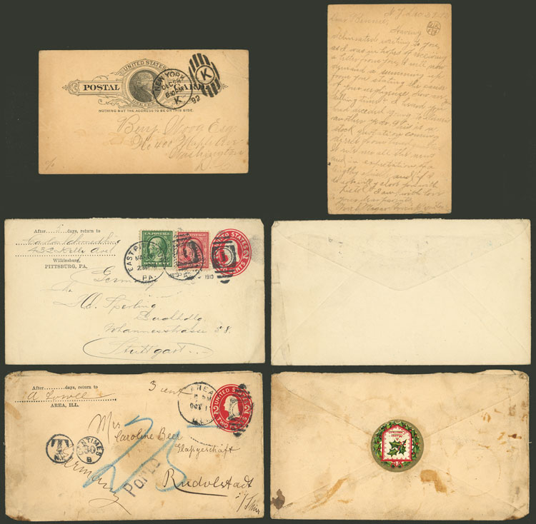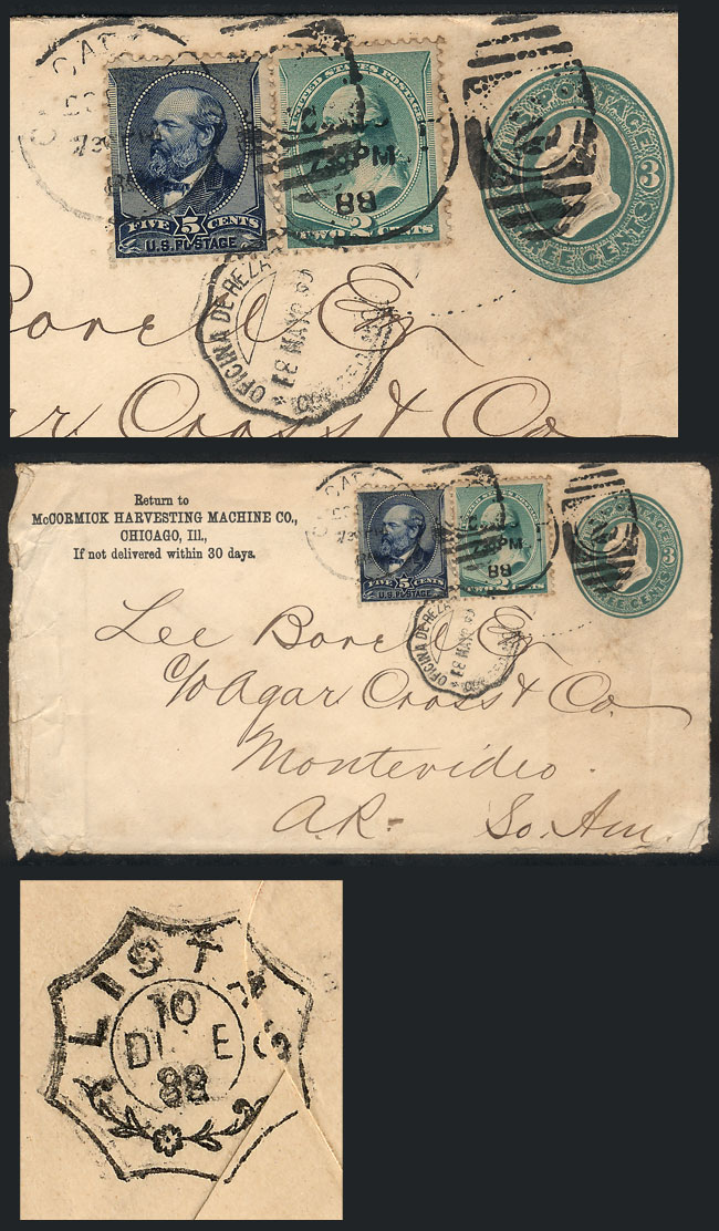 Stationery envelope with additional postage (total 10c.), sent from Chicago to Uruguay in NO/1888, with marks of Montevideo: of Oficina de Listas (on back, 10/DE/1888) and Oficina de Rezagos (on front, 8/MAY/1889), interesting! (Image) (Image-02)