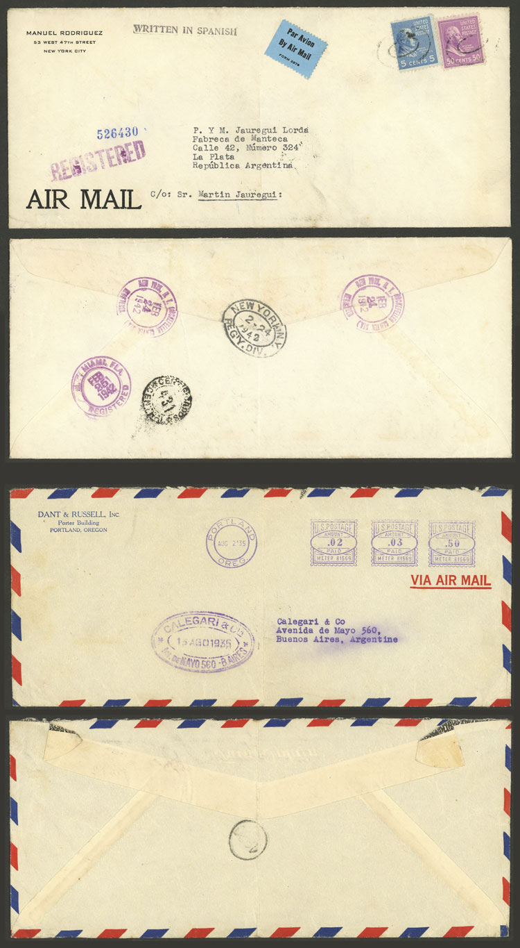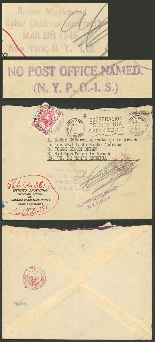 AUXILIARY MARKS: Cover sent on 2/JA/1946 from Buenos Aires to "Rear Admiral of the US Navy, D. Jorge Sloan Bryan, Hydrographer of the Navy, USA" (imprecise address), and returned to sdener with the violet marks: "Retour Misdirected - Rebut (Address