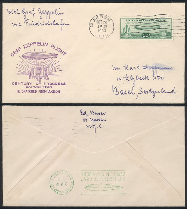 franked by Mi.358, sent from Akron to Switzerland on 28/OC/1933, with special handstamp of Zeppelin flight and Friedrichshafen transit of 2/NOV, excellent quality! (Michel 255Cc) (Image) (Image-02)