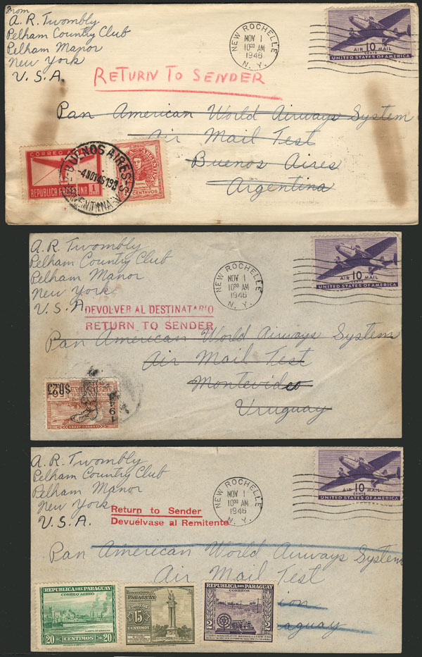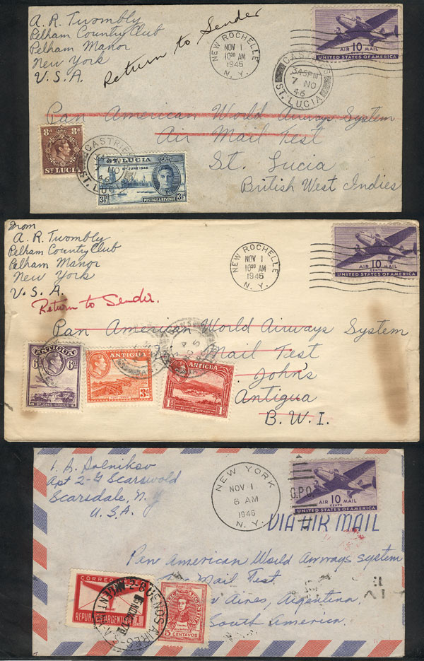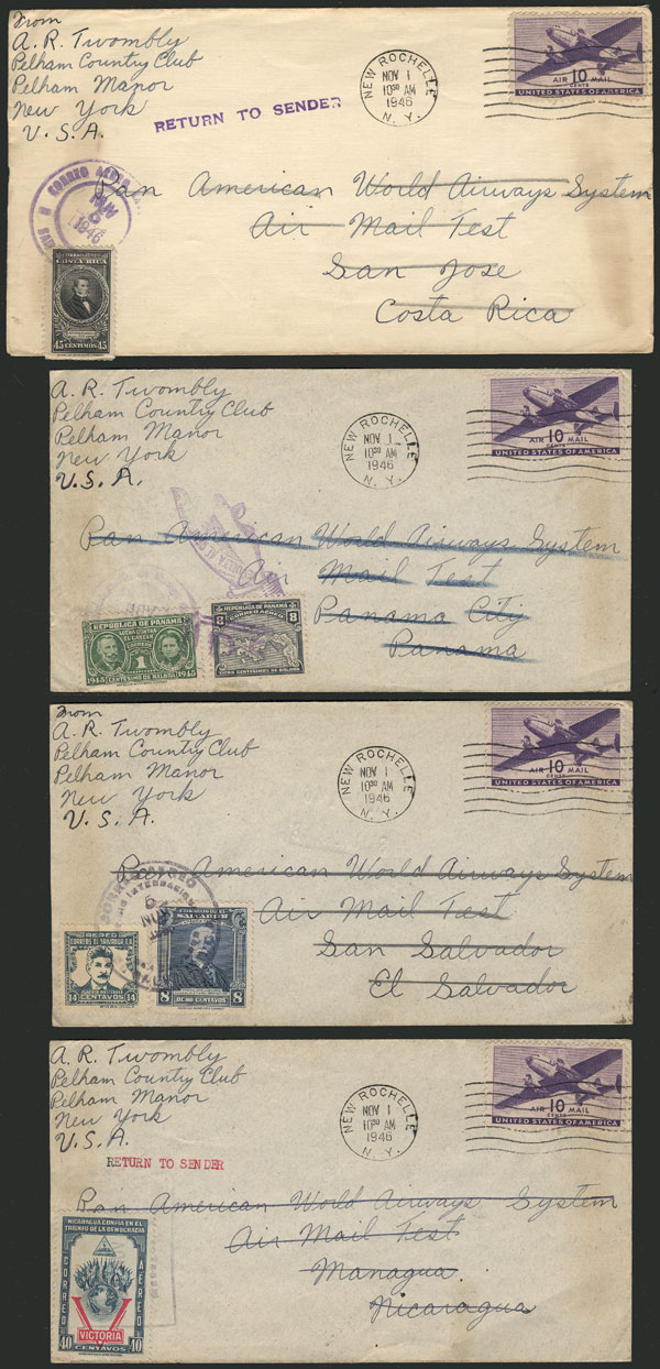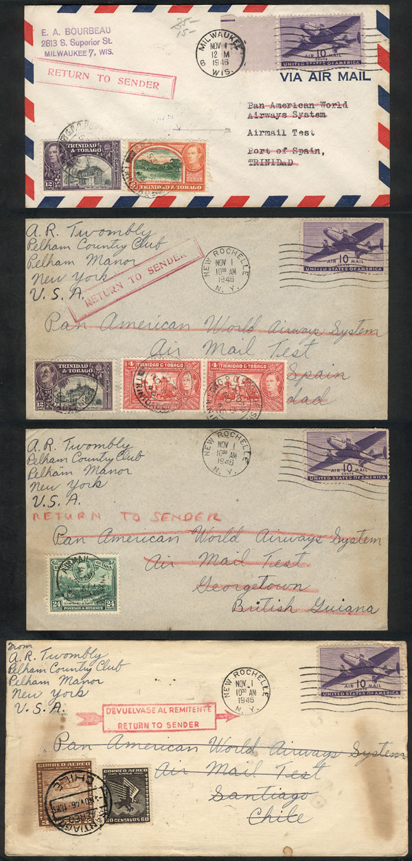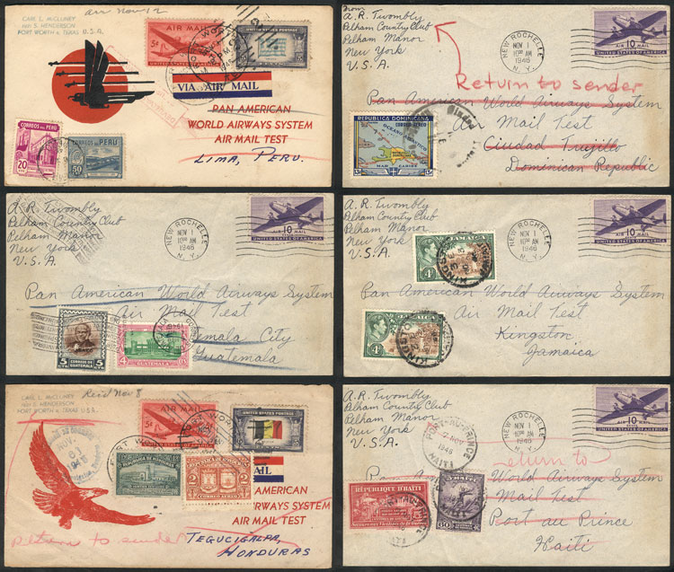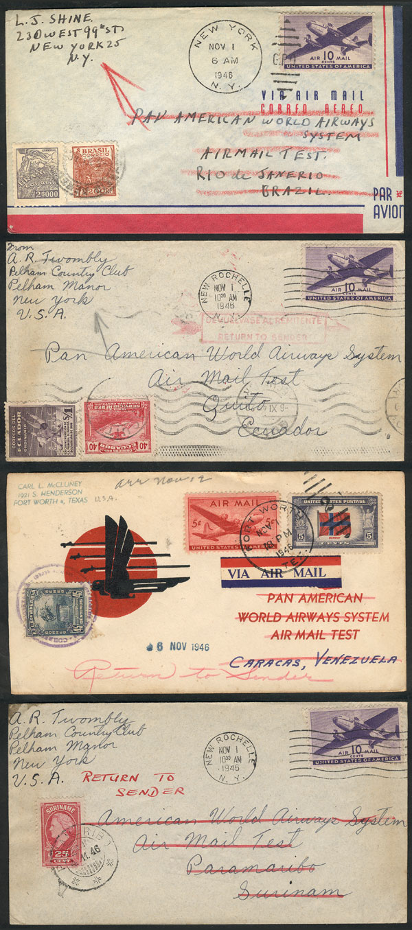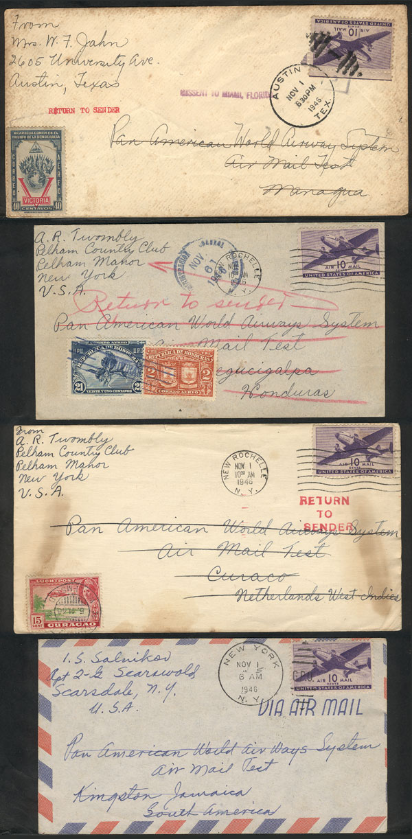 1/NO/1946: 28 Test flight covers sent via Pan American to various countries in South and Central America and the Caribbean, all returned to sender with additional postage of the various destination countries, some countries duplicated