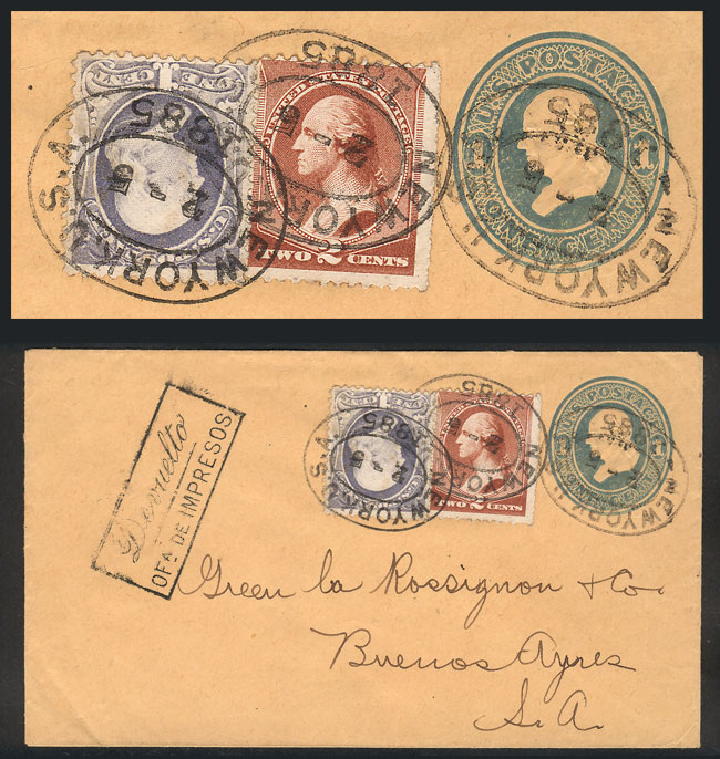 Stationery envelope + 1c. Franklin + 2c. Washington (total 4c.) to pay the rate for PRINTED MATTER, sent from New York to Argentina on 5/FE/1885, on front it bears a mark of the Argentine Mail: "Devuelto - Oficina de Impresos", excellent quality! (Image) (Image-02)