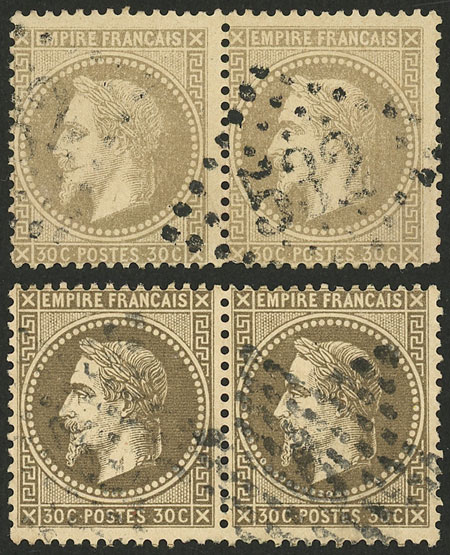 1863/70 30c. Napoleon III, 2 used pairs, very different shades, very fine quality! (Image)