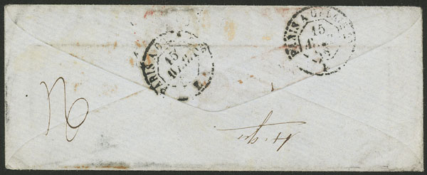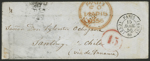 15/AP/1856 Paris to SANTIAGO DE CHILE, small cover with nice marks on front and back, with some wear else excellent, very nice! (Image) (Image-02)