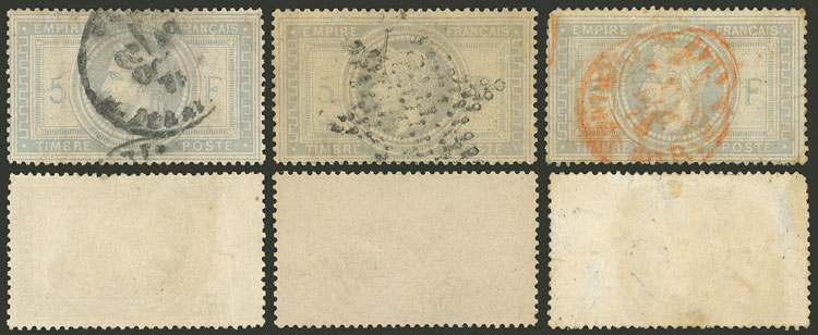 33, 1967 5Fr. Napoleon, 2 used examples of fine quality, we also include (not considered in the estimate) another example with an attractive red cancel (with defects), good opportunity! (Image)