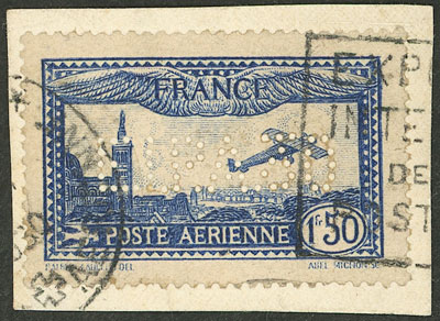 6c, 1930 1.50Fr. blue with perforated "E.I.P.A.30", used on fragment, very fine quality! (Image)