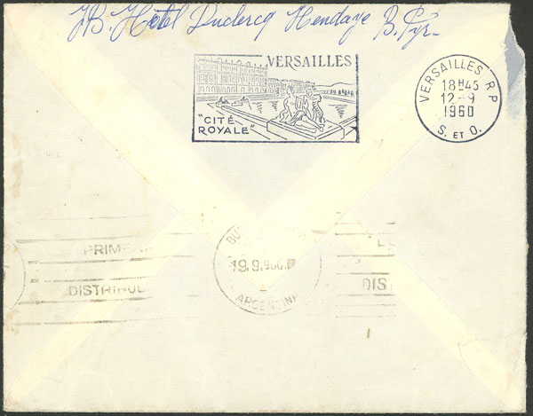 FIRST FLIGHT COVER "BY CHANCE": Cover originally sent from Hendaye to Versailles on 8/SE/1960 franked with 25c., but upon arrival the addressee was absent (in Argentina), and it was returned to sender (to a hotel in Hendaye) but the
