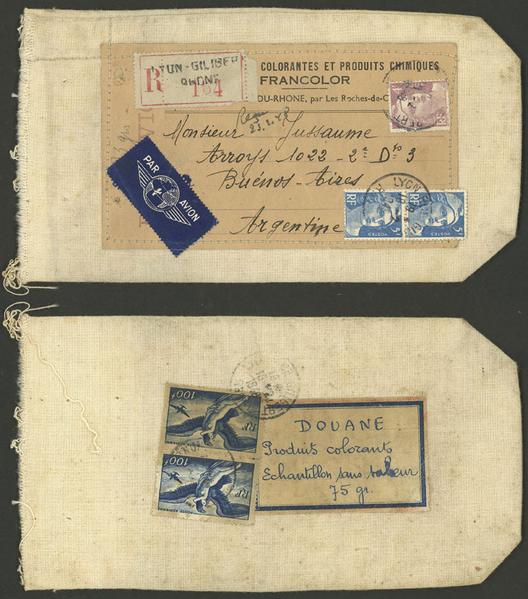 RATE for registered airmail of "Samples without value" sent from Lyon to Argentina on 18/FE/1949, franked with 214Fr., very attractive and unusual! (Image)