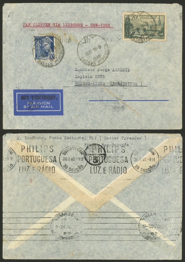 18/SE/1940 Nay (Pyrénées-Atlantiques) - Argentina, airmail cover sent by "Clipper via Lisboa" franked with 20.50Fr., on back there is a transit mark of Lisboa for 26/SE and Buenos Aires arrival of 6/OC, VF quality and very interesting
