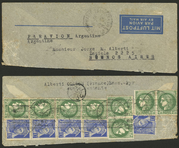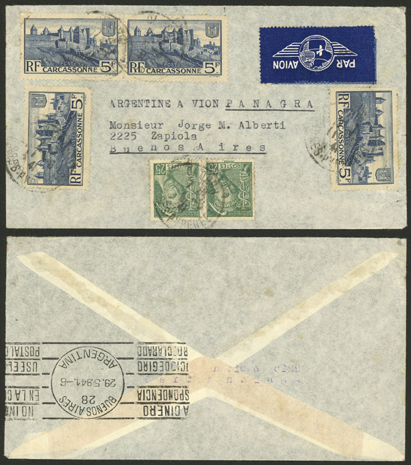 11/AP/1941 Oloron (Pyrénées-Atlantiques) - Argentina, airmail cover sent by "PANAGRA" franked with 20.50Fr., on back there is an arrival mark of Buenos Aires 29/MAY, VF quality and very interesting piece of mail from the part of France
