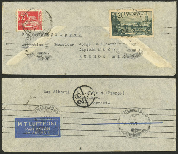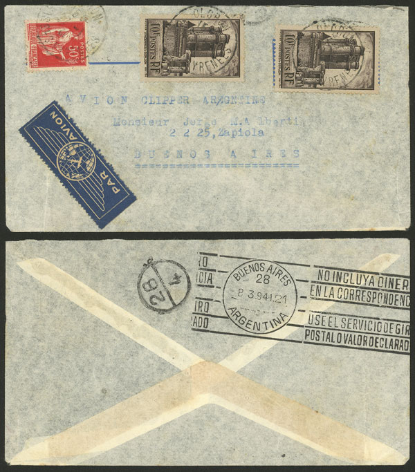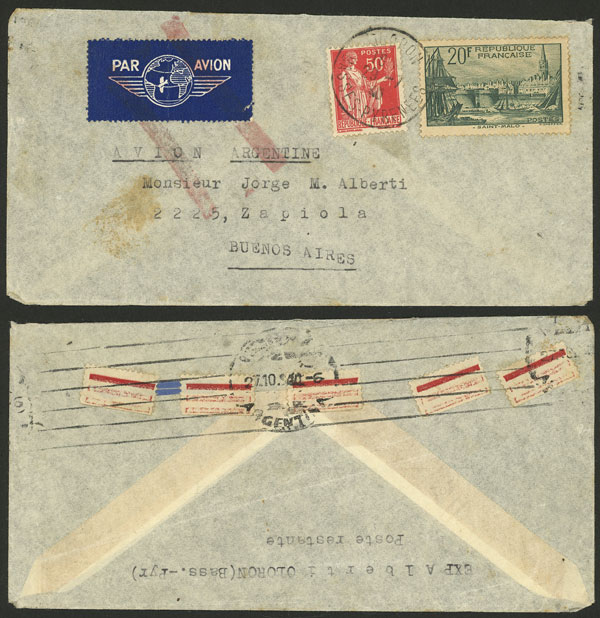 30/SE/1940 Oloron (Pyrénées-Atlantiques) - Argentina, airmail cover sent by "Clipper airplane" franked with 20.50Fr., on back it bears a Buenos Aires arrival mark for 20/OC, VF quality and very interesting piece of mail from the part of