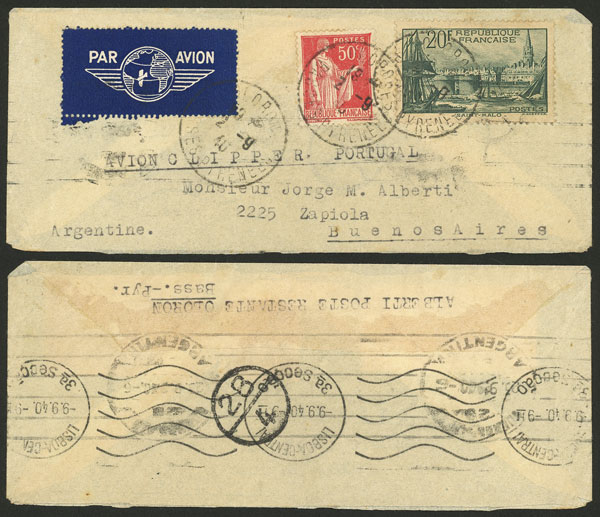 2/SE/1940 Oloron (Pyrénées-Atlantiques) - Argentina, small airmail cover sent by "CLIPPER - Portugal" franked with 20.50Fr., on back there is a transit mark of Lisboa 9/SE arrival mark of Buenos Aires 23/SE, VF quality and very