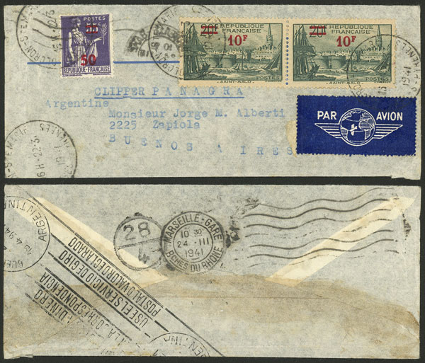 22/MAR/1942 Oloron (Pyrénées-Atlantiques) - Argentina, airmail cover sent by "Clipper PANAGRA" and franked with 20.50Fr., on back it bears a transit mark of Marseille 24/MAR and Buenos Aires arrival for 19/AP, VF quality and very