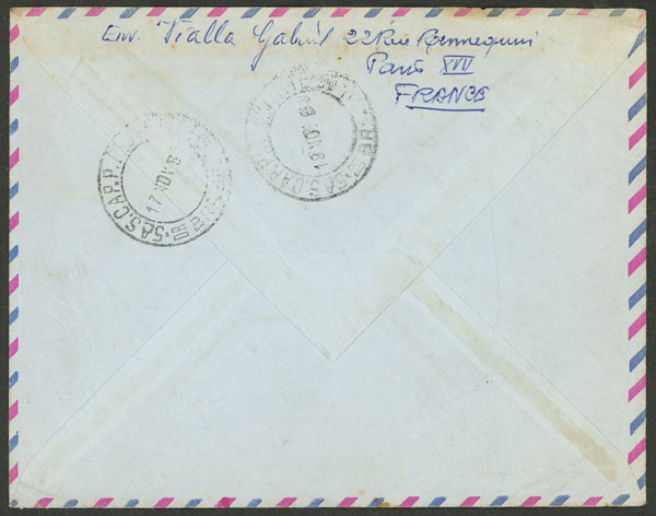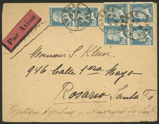8/SE/1928 Auxerre to Argentina, airmail cover with nice franking of 9Fr., on back arrival mark of Buenos Aires 26/SE, very attractive! (Image) (Image-02)