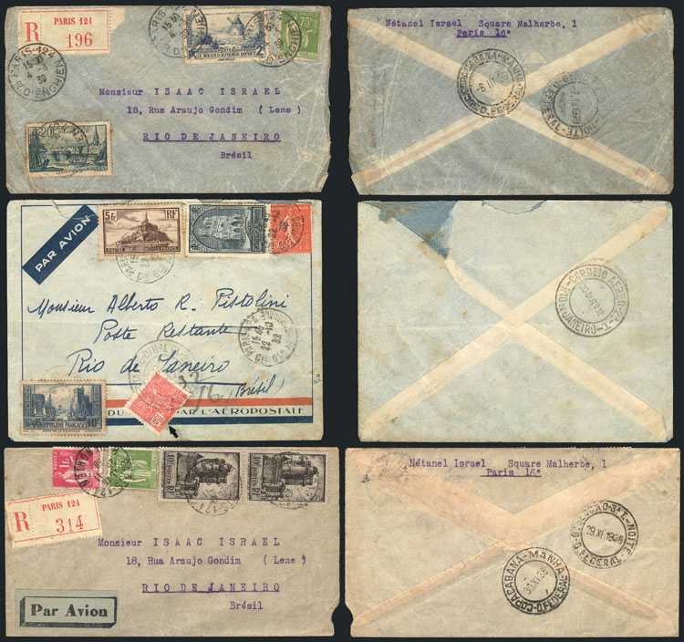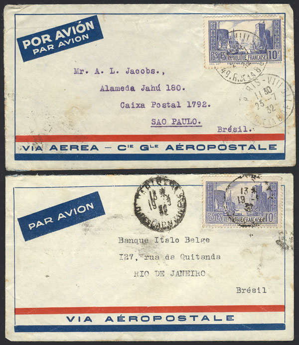 Airmail covers franked with 10Fr. Port de la Rochelle ALONE, types I and II, sent from Paris to Rio de Janeiro in 1932, VF quality! (Image) (Image-02)