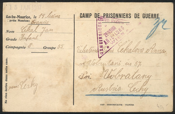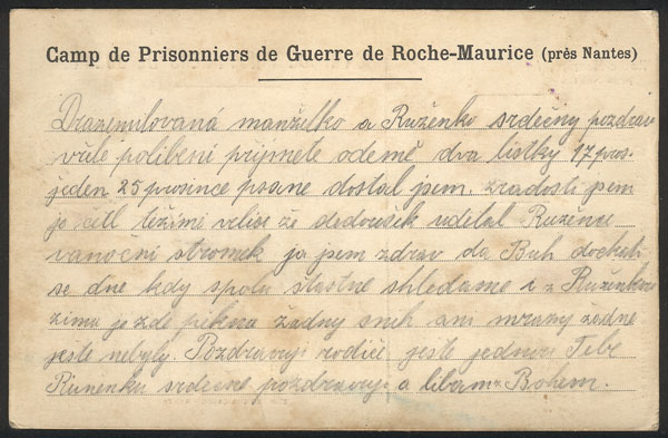Card sent by a Czech PRISONER OF WAR in the POW camp of Roche-Maurice with postal franchise for POW, VF and interesting! (Image) (Image-02)