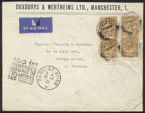 17/JUL/1936 Manchester - Argentina, by Air France, airmail cover with special mark applied in Paris 19/JUL commemorating 100th crossing of the South Atlantic, VF! (Image) (Image-02)