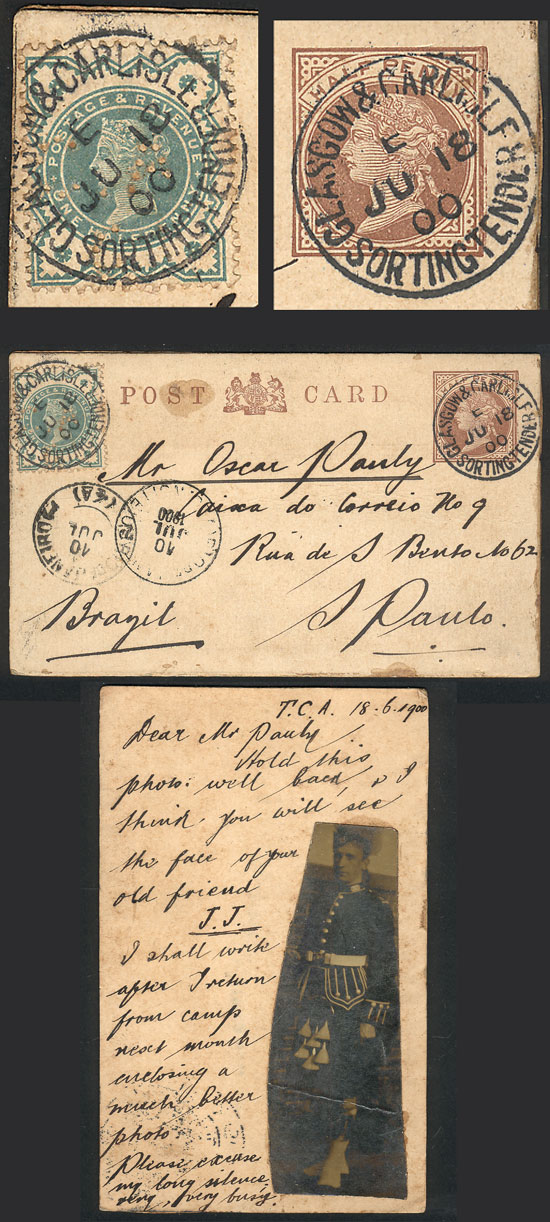 Postal card uprated with a ½p. stamp with commercial PERFIN, cancelled "GLASGOW & CARLISLE - SORTING TENDER", sent to Sao Paulo on 18/JUN/1900, with photo of a soldier glued on back, VF and interesting! (Image)