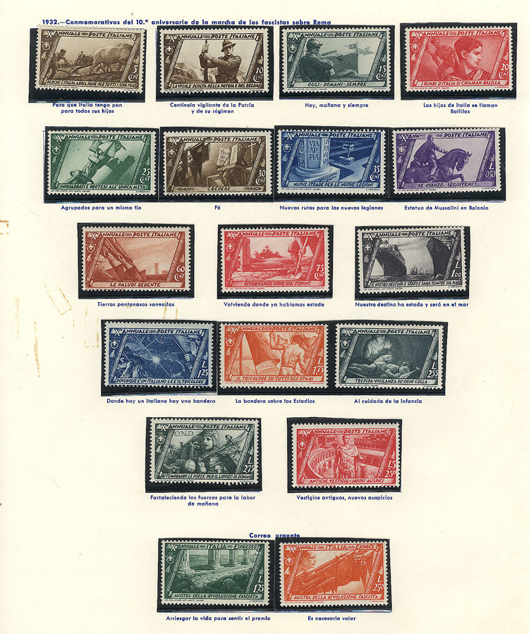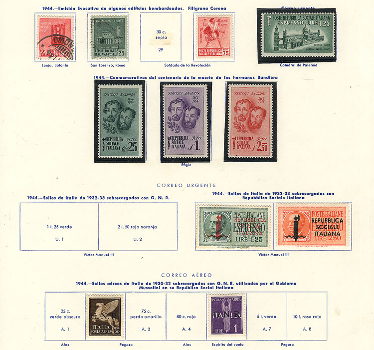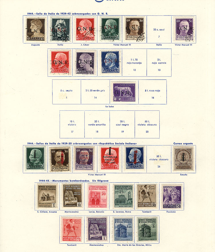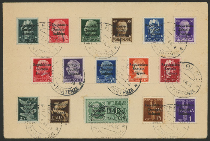 franked with the complete set of 16 values overprinted "Repubblica Sociale Italiana" in Teramo (Sassone 1/16, Euros 1,000 as used), cancelled 27/FE/1944, excellent quality!