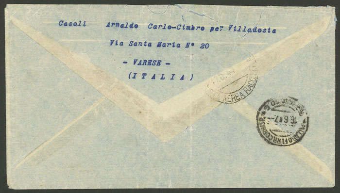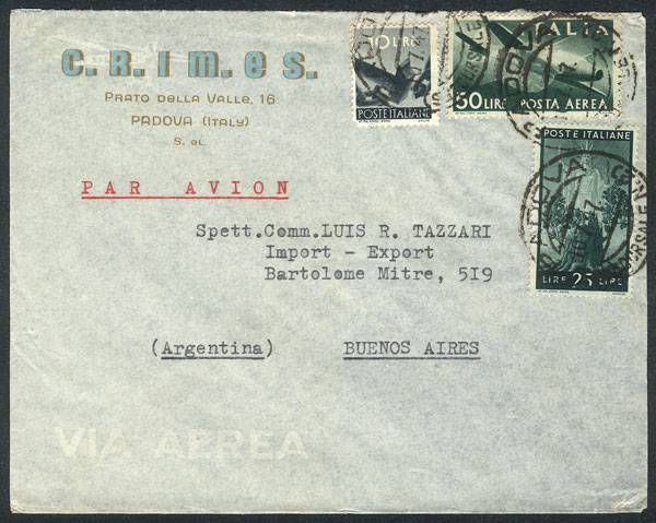 Cover franked by Sa.132 airmail + other values (total 85L.), sent from Padova to Argentina on 10/JUL/1947, excellent quality! (Image) (Image-02)