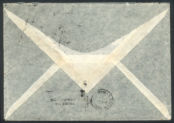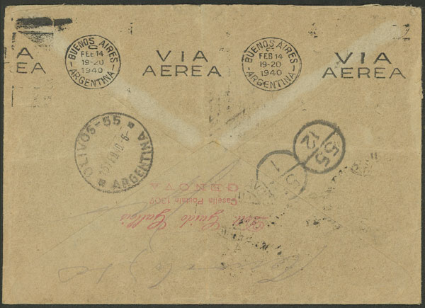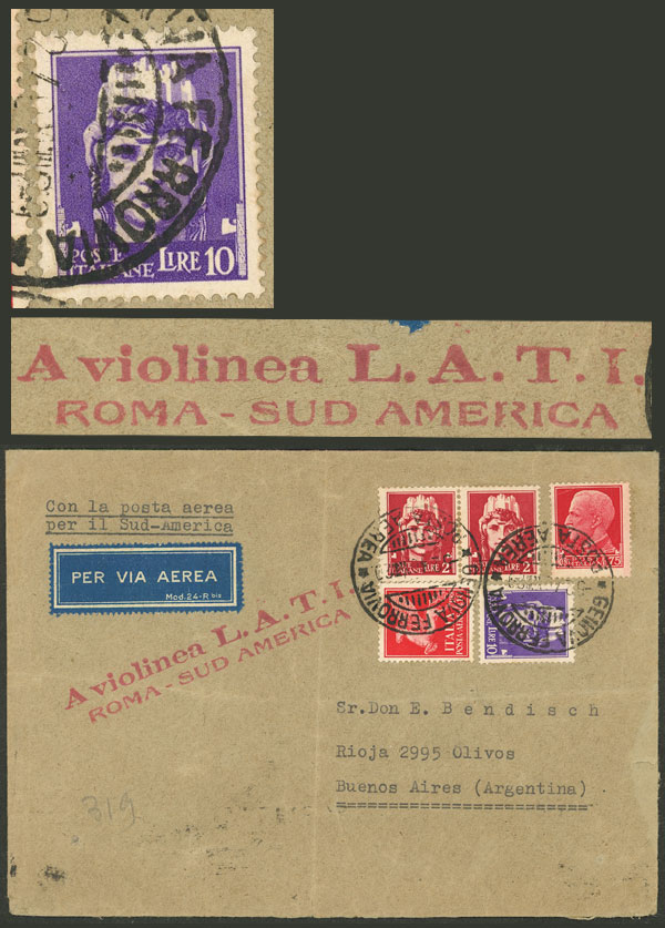 31/JA/1940 Genova to Argentina, airmail cover franked with 24.75L. that includes TWIN VALUES OF 10L, with rose-lilac mark "A violinea L.A.T.I. - ROMA - SUD AMERICA", and arrival backstamp of Buenos Aires 14/FE, with some creases but of