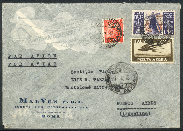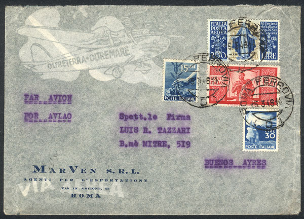 Cover franked by Sa.146 airmail + other values (total 135L.), sent from Roma to Argentina on 17/AP/1948, excellent quality! (Image) (Image-02)