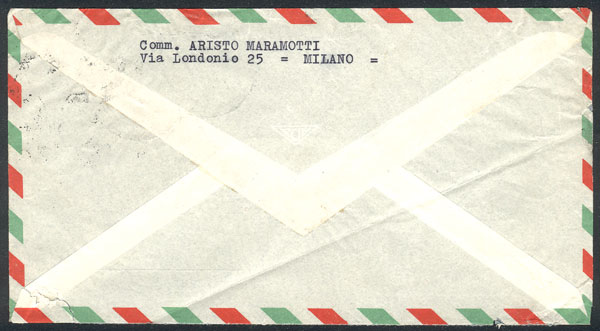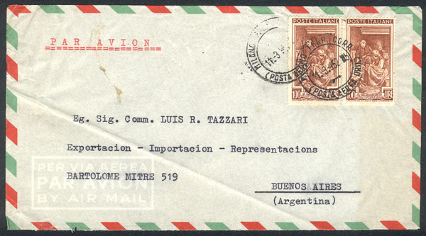 Cover franked by Sa.651 pair ALONE (total 200L.), sent from Milano to Argentina on 11/MAR/1952, fine quality! (Image) (Image-02)