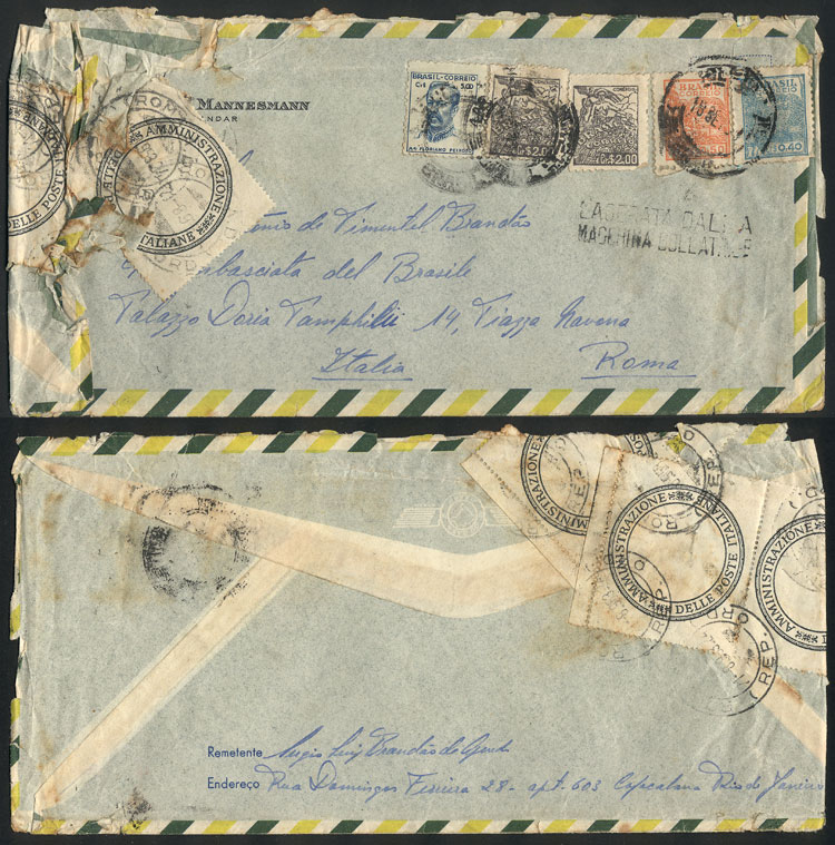 cover sent from Rio de Janeiro (Brazil) to Roma on 16/SE/1953, it was damaged by the sorting machine and it was sealed with several labels (official seals), it also bears the mark: "LACERATA DALL'A MACCHINA BOLLATALE", very interesting! (Image)