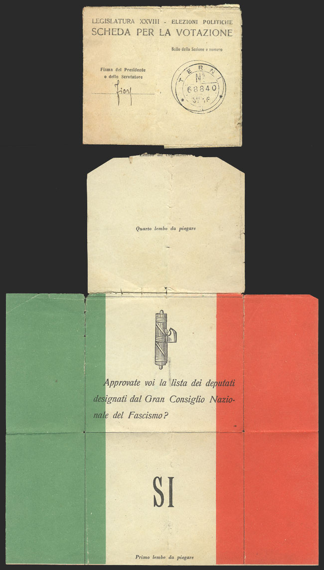 Pro-Fascist ballot card of the 1934 general election, with the "yes" mark, and handstamp of Terni on back, minor defects, VF appearance (Image)