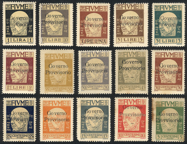 Sc.134/148, 1921 Provisional Government, cmpl. set of 15 overprinted values, almost all with original gum with stain spots, the 1L. (Sc.143) and 10L. (Sc.147) values are MNH perfect (with a catalog value of US$565), the rest needs