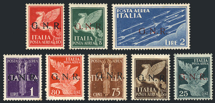 1/8, 1944 complete set of 8 values overprinted "G.N.R.", mint original gum but with minor defects (the high value of VF quality but with a small hinge remnant, the rest with defects on front or back), rare set, Yvert catalogue value Euros 1,125 (the