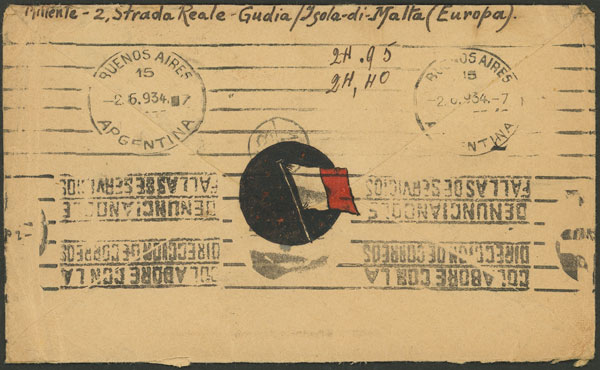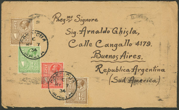 RARE DESTINATION: Cover franked with 2½p. sent from Cospicua to Argentina on 7/MAY/1934, with Buenos Aires arrival backstamp of 2/JUN, very attractive!