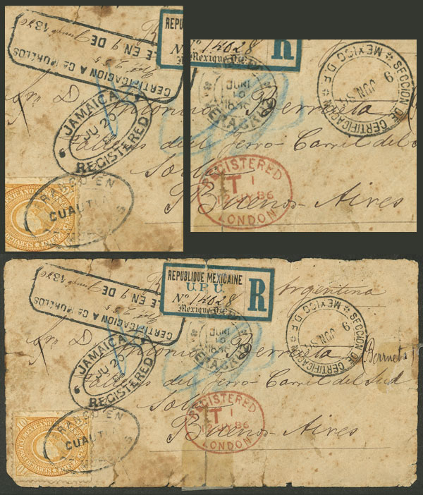 CROSSING OF THE ATLANTIC AND RARE DESTINATION: Cover front sent to Argentina franked with 10c. with oval cancel "FRANCO EN CUAUTLA DE MORELOS", with rectangular mark "CERTIFICACION A Ca MORELOS - SALE EN 9/JUN/1886", transit marks of "MEXICO D.F."