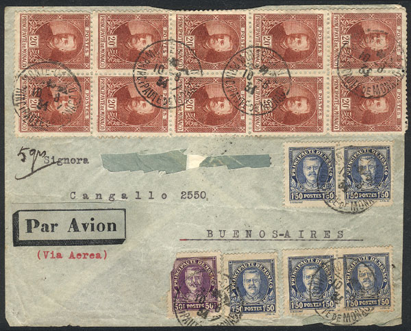 Airmail cover with spectacular postage of 10Fr., including Sc.122 x5 (value as used US$52.50), sent to Argentina on 10/JUN/1934, the name of the addressee is cut out, otherwise very fine quality, rare, very nice and colorful postage! (Image) (Image-02)